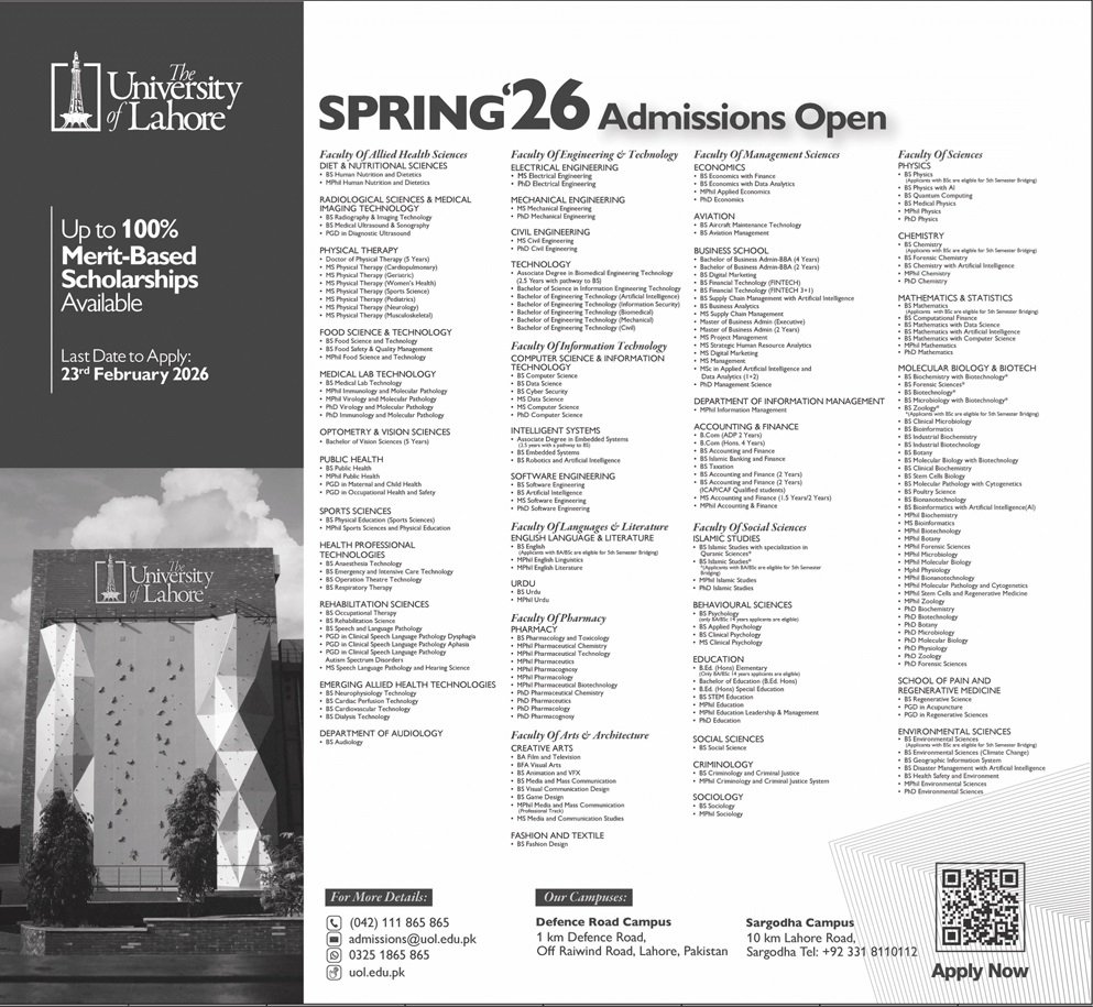 Admission Open in The University of Lahore Punjab 2026 announce the Contract career opportunities for the post of See Below Ad in Punjab, Lahore for the fresh and experienced candidates on Contract basis who have Check Advertisement degree. Posted date of this post is 15/02/2026 and the last date is 22/02/2026. if you are eligible for this job apply before due date.