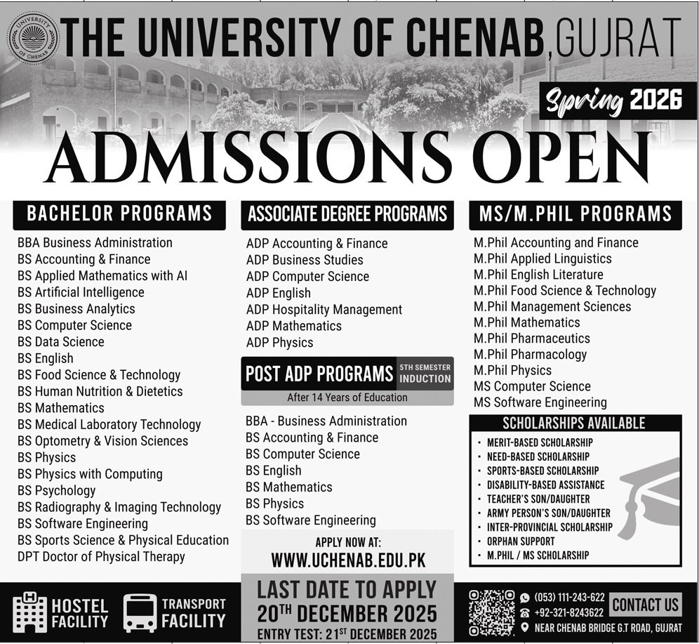 University of Chenab announce the latest in different programs, details are mentioned in See Below Ad . Students from Punjab, Gujrat and other provinces of Pakistan, can apply for the . Students awaiting for the s in University of Chenab can apply according the given criteria which is mentioned in the advertisement. Students awaiting results may also apply. Advertisement date is 30/11/2025 and the last date of the admission is 20/12/2025