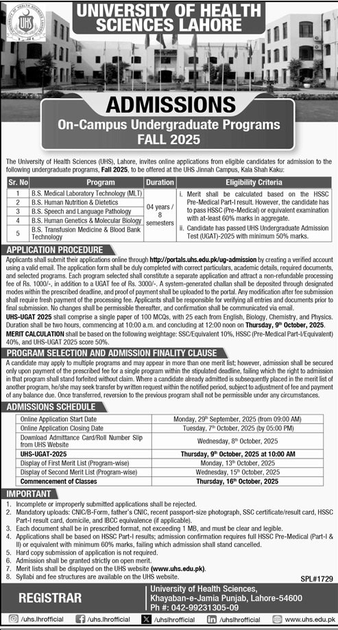 University of Health Sciences Lahore announce the latest in different programs, details are mentioned in See Below Ad . Students from Punjab, Lahore and other provinces of Pakistan, can apply for the . Students awaiting for the s in University of Health Sciences Lahore can apply according the given criteria which is mentioned in the advertisement. Students awaiting results may also apply. Advertisement date is 28/09/2025 and the last date of the admission is 07/10/2025