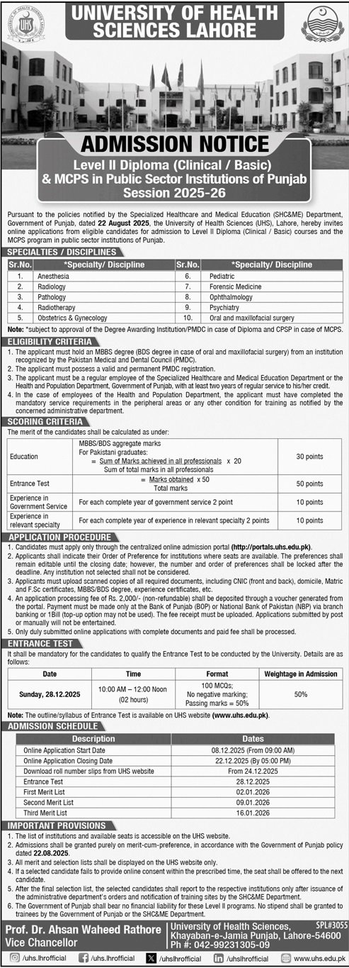 University of Health Sciences Lahore announce the latest in different programs, details are mentioned in See Below Ad . Students from Punjab, Lahore and other provinces of Pakistan, can apply for the . Students awaiting for the s in University of Health Sciences Lahore can apply according the given criteria which is mentioned in the advertisement. Students awaiting results may also apply. Advertisement date is 07/12/2025 and the last date of the admission is 22/12/2025