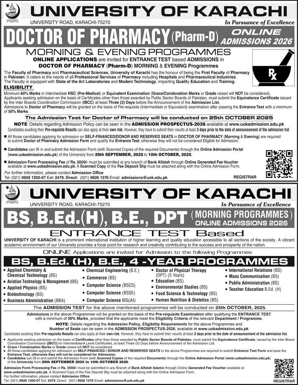 University of Karachi announce the latest in different programs, details are mentioned in See Below Ad . Students from Sindh, Karachi and other provinces of Pakistan, can apply for the . Students awaiting for the s in University of Karachi can apply according the given criteria which is mentioned in the advertisement. Students awaiting results may also apply. Advertisement date is 28/09/2025 and the last date of the admission is 29/10/2025