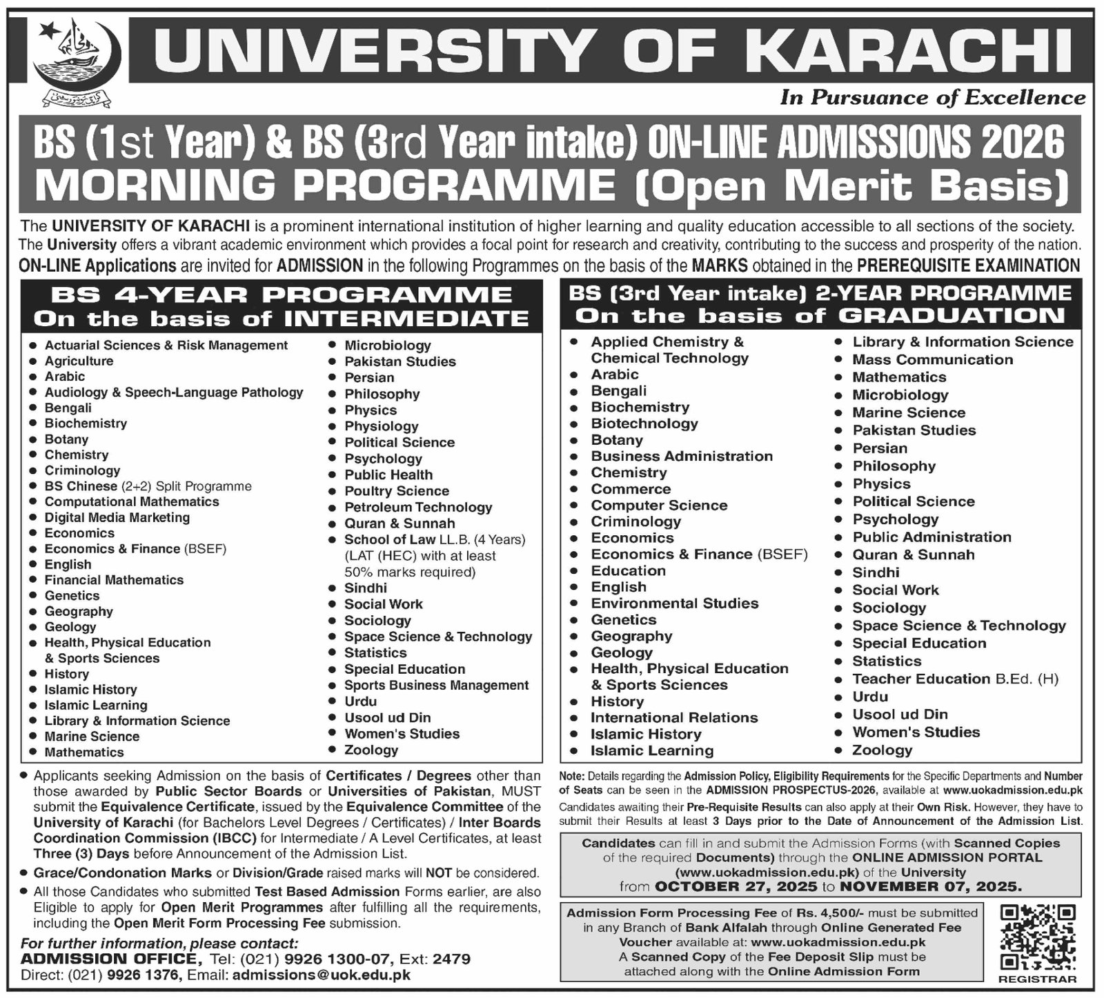 University of Karachi announce the latest in different programs, details are mentioned in See Below Ad . Students from Sindh, Bhakkar and other provinces of Pakistan, can apply for the . Students awaiting for the s in University of Karachi can apply according the given criteria which is mentioned in the advertisement. Students awaiting results may also apply. Advertisement date is 26/10/2025 and the last date of the admission is 07/11/2025