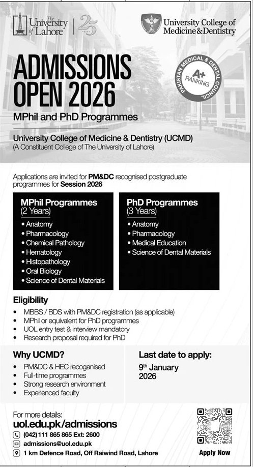 University of Lahore announce the latest in different programs, details are mentioned in See Below Ad . Students from Punjab, Lahore and other provinces of Pakistan, can apply for the . Students awaiting for the s in University of Lahore can apply according the given criteria which is mentioned in the advertisement. Students awaiting results may also apply. Advertisement date is 28/12/2025 and the last date of the admission is 09/01/2026