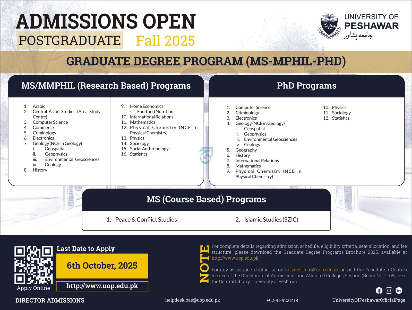 University of Peshawar announce the latest in different programs, details are mentioned in See Below Ad . Students from Khyber Pakhtunkhwa, Peshawar and other provinces of Pakistan, can apply for the . Students awaiting for the s in University of Peshawar can apply according the given criteria which is mentioned in the advertisement. Students awaiting results may also apply. Advertisement date is 26/09/2025 and the last date of the admission is 06/10/2025