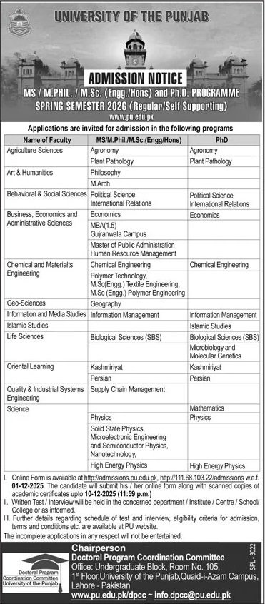 University of Punjab announce the latest in different programs, details are mentioned in See Below Ad . Students from Punjab, Lahore and other provinces of Pakistan, can apply for the . Students awaiting for the s in University of Punjab can apply according the given criteria which is mentioned in the advertisement. Students awaiting results may also apply. Advertisement date is 30/11/2025 and the last date of the admission is 10/12/2025