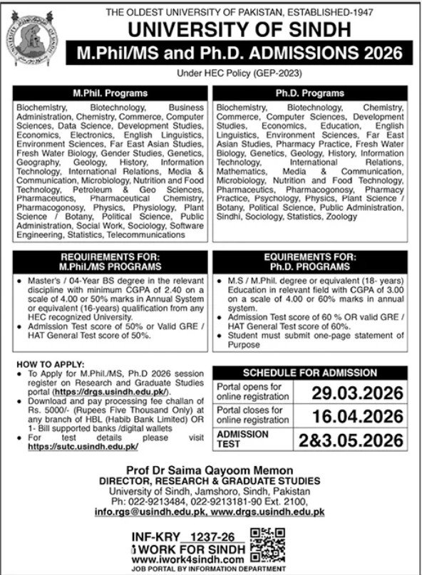 Admission Open in University of Sindh Jamsharo 2026 announce the Contract career opportunities for the post of See Below Ad in Sindh, Jamshoro for the fresh and experienced candidates on Contract basis who have Check Advertisement degree. Posted date of this post is 29/03/2026 and the last date is 16/04/2026. if you are eligible for this job apply before due date.