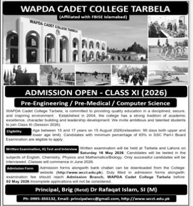 WAPDA Cadet College Tarbela announce the latest in different programs, details are mentioned in See Below Ad . Students from Khyber Pakhtunkhwa and other provinces of Pakistan, can apply for the . Students awaiting for the s in WAPDA Cadet College Tarbela can apply according the given criteria which is mentioned in the advertisement. Students awaiting results may also apply. Advertisement date is 22/02/2026 and the last date of the admission is 15/05/2026