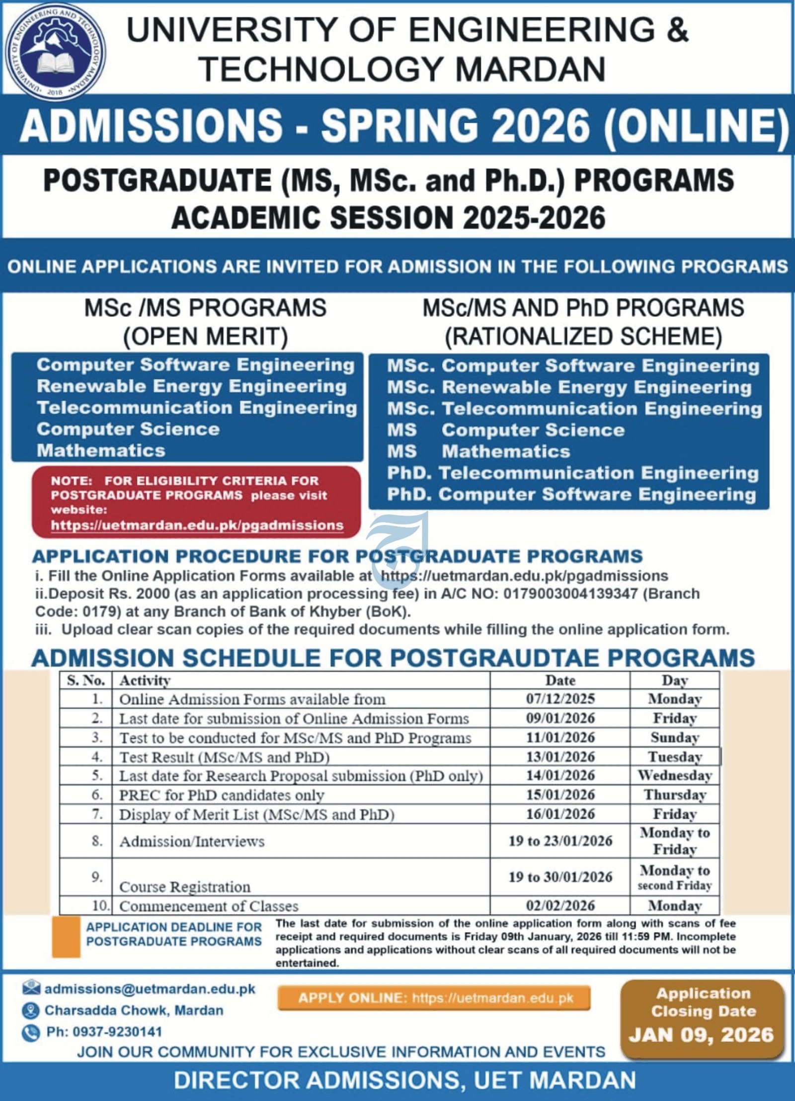 University of Engineering and Technology Mardan announce the latest in different programs, details are mentioned in See Below Ad . Students from Khyber Pakhtunkhwa, Mardan and other provinces of Pakistan, can apply for the . Students awaiting for the s in University of Engineering and Technology Mardan can apply according the given criteria which is mentioned in the advertisement. Students awaiting results may also apply. Advertisement date is 07/12/2025 and the last date of the admission is 09/01/2026