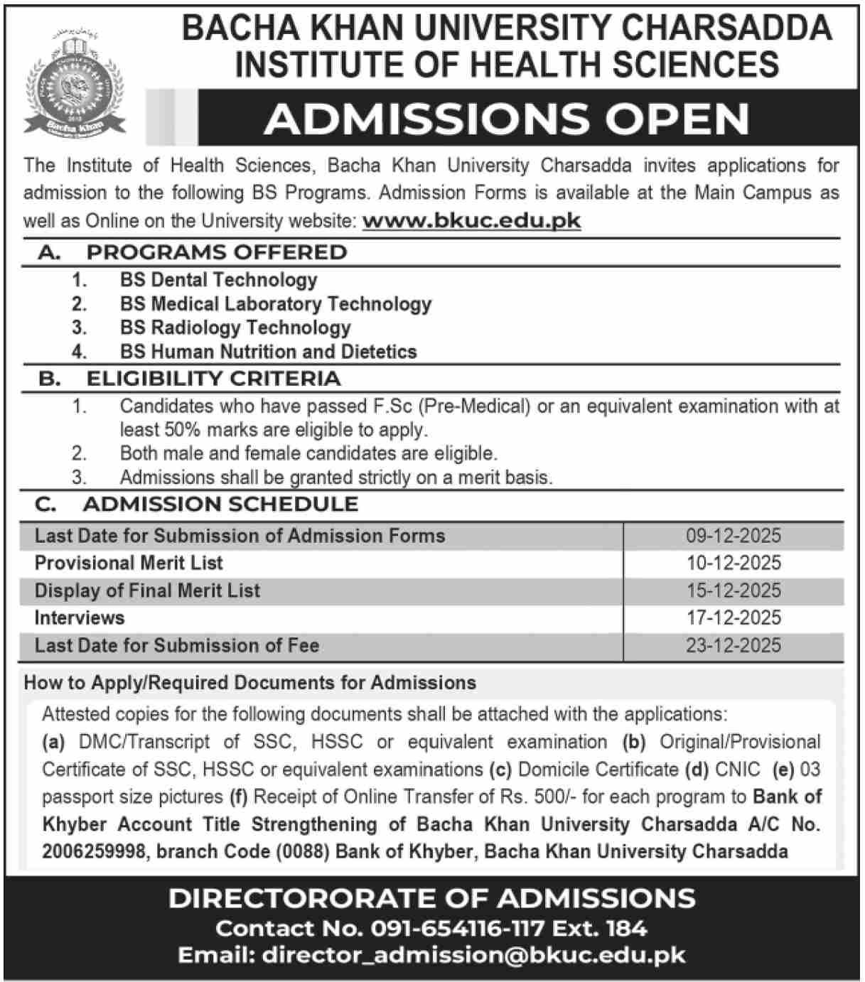 Bacha Khan University Charsada announce the latest Admission in different programs, details are mentioned in See Below Ad . Students from Khyber Pakhtunkhwa, Charsadda and other provinces of Pakistan, can apply for the Admission. Students awaiting for the Admissions in Bacha Khan University Charsada can apply according the given criteria which is mentioned in the advertisement. Students awaiting results may also apply. Advertisement date is 15/11/2025 and the last date of the admission is 23/12/2025