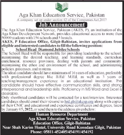 Agha Khan Education Service Gilgit Baltistan Jobs announce the Contract career opportunities for the post of See Below Ad in Gilgit Baltistan for the fresh and experienced candidates on Contract basis who have Check Advertisement degree. Posted date of this post is 22/12/2021 and the last date is 05/01/2022. if you are eligible for this job apply before due date.