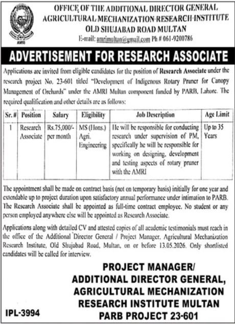 Agricultural Mechanization Research Institute Multan Job announce the Contract career opportunities for the post of See Below Ad in Punjab, Multan for the fresh and experienced candidates on Contract basis who have Check Advertisement degree. Posted date of this post is 26/04/2026 and the last date is 13/05/2026. if you are eligible for this job apply before due date.