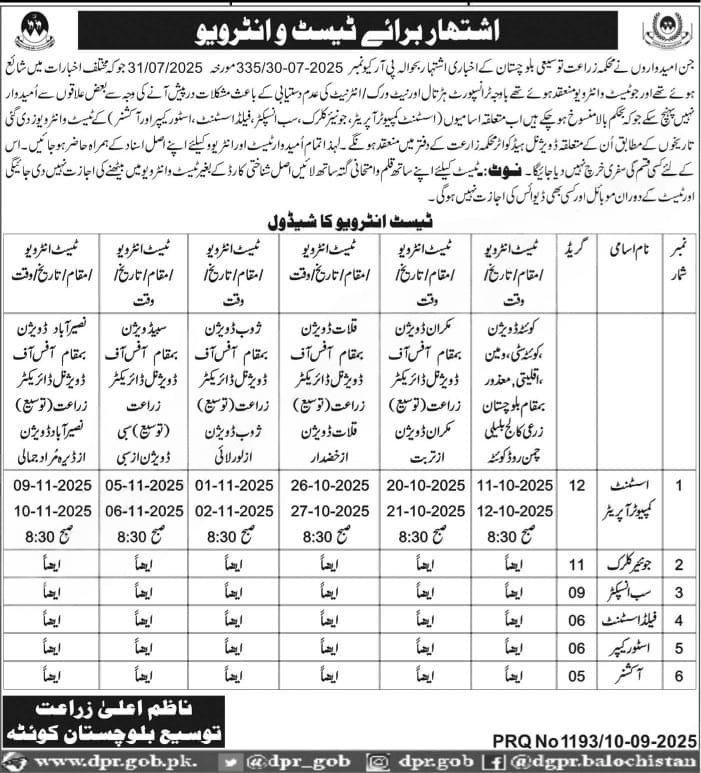 Candidates who applied for the posts advertised by the Agriculture Extension Department Balochistan vide PRQ No. 2025-07-335/30 dated 31/07/2025, which was published in various newspapers, and whose tests and interviews were scheduled, but could not attend due to transport strike and network/internet unavailability in some areas, are informed that those tests and interviews have been cancelled as per higher authority orders. Now, the tests and interviews for the concerned posts (Assistant Computer Operator, Junior Clerk, Sub-Inspector, Field Assistant, Store Keeper, and Auctioneer) will be held at the respective Divisional Headquarter offices of the Agriculture Department on the dates given in the schedule below. Therefore, all candidates are required to appear with their original documents for the test and interview. No travel allowance will be provided for this. Note: Bring a pen and examination board for the test. Entry to the test and interview will not be allowed without the original CNIC, and mobile phones or any other device are not permitted during the test.