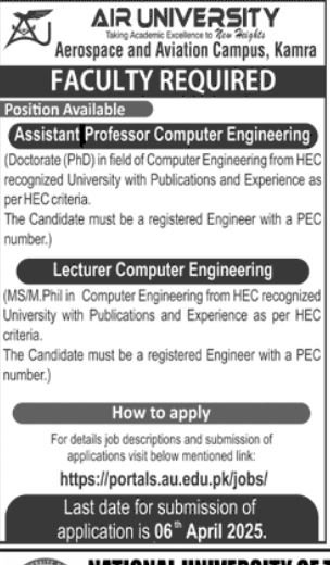 - The Candidate must be a registered Engineer with a PEC number.Lecturer Computer Engineering (MS/M.Phil in Computer Engineering from HEC recognized University with Publications and Experience as per HEC criteria.