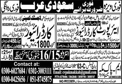 Airport Car Driver And Car Driver Jobs in Saudia Arabia 2026 announce the Contract career opportunities for the post of See Below Ad in Saudi Arabia for the fresh and experienced candidates on Contract basis who have Check Advertisement degree. Posted date of this post is 14/01/2026 and the last date is 16/01/2026. if you are eligible for this job apply before due date.