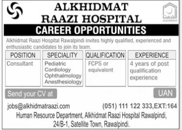 Alkhidmat Raazi Hospital Rawalpindi Jobs 2026 announce the Contract career opportunities for the post of See Below Ad in Punjab, Rawalpindi for the fresh and experienced candidates on Contract basis who have Check Advertisement degree. Posted date of this post is 01/03/2026 and the last date is 10/03/2026. if you are eligible for this job apply before due date.