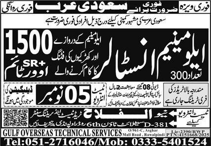 Aluminum Installer Jobs Career Opportunity In Saudi Arabia announce the Contract career opportunities for the post of See Below Ad in Saudi Arabia for the fresh and experienced candidates on Contract basis who have Check Advertisement degree. Posted date of this post is 31/10/2025 and the last date is 05/11/2025. if you are eligible for this job apply before due date.