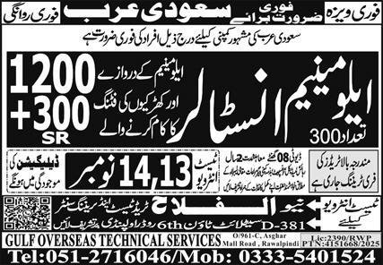 Aluminum Installer Jobs Open In Saudi Arabia 2025 announce the Contract career opportunities for the post of See Below Ad in Saudi Arabia for the fresh and experienced candidates on Contract basis who have Check Advertisement degree. Posted date of this post is 12/11/2025 and the last date is 14/11/2025. if you are eligible for this job apply before due date.
