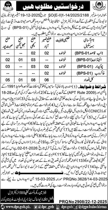 Animal Health Livestock & Dairy Development Jobs 2026 announce the Contract career opportunities for the post of See Below Ad in Balochistan, Quetta for the fresh and experienced candidates on Contract basis who have Check Advertisement degree. Posted date of this post is 23/12/2025 and the last date is 02/01/2026. if you are eligible for this job apply before due date.