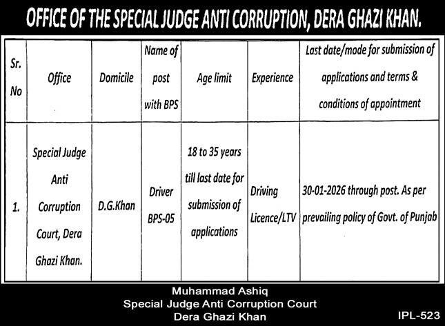 Anti Corruption Court ATC Dera Ghazi Khan Jobs 2026 announce the Contract career opportunities for the post of See Below Ad in Punjab, Dera Ghazi Khan for the fresh and experienced candidates on Contract basis who have Check Advertisement degree. Posted date of this post is 15/01/2026 and the last date is 30/01/2026. if you are eligible for this job apply before due date.