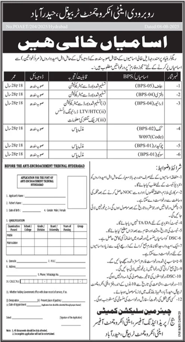 Anti Encroachment Tribunal Hyderabad Jobs 2025 announce the Contract career opportunities for the post of See Below Ad in Sindh, Hyderabad for the fresh and experienced candidates on Contract basis who have Check Advertisement degree. Posted date of this post is 13/08/2025 and the last date is 23/08/2025. if you are eligible for this job apply before due date.