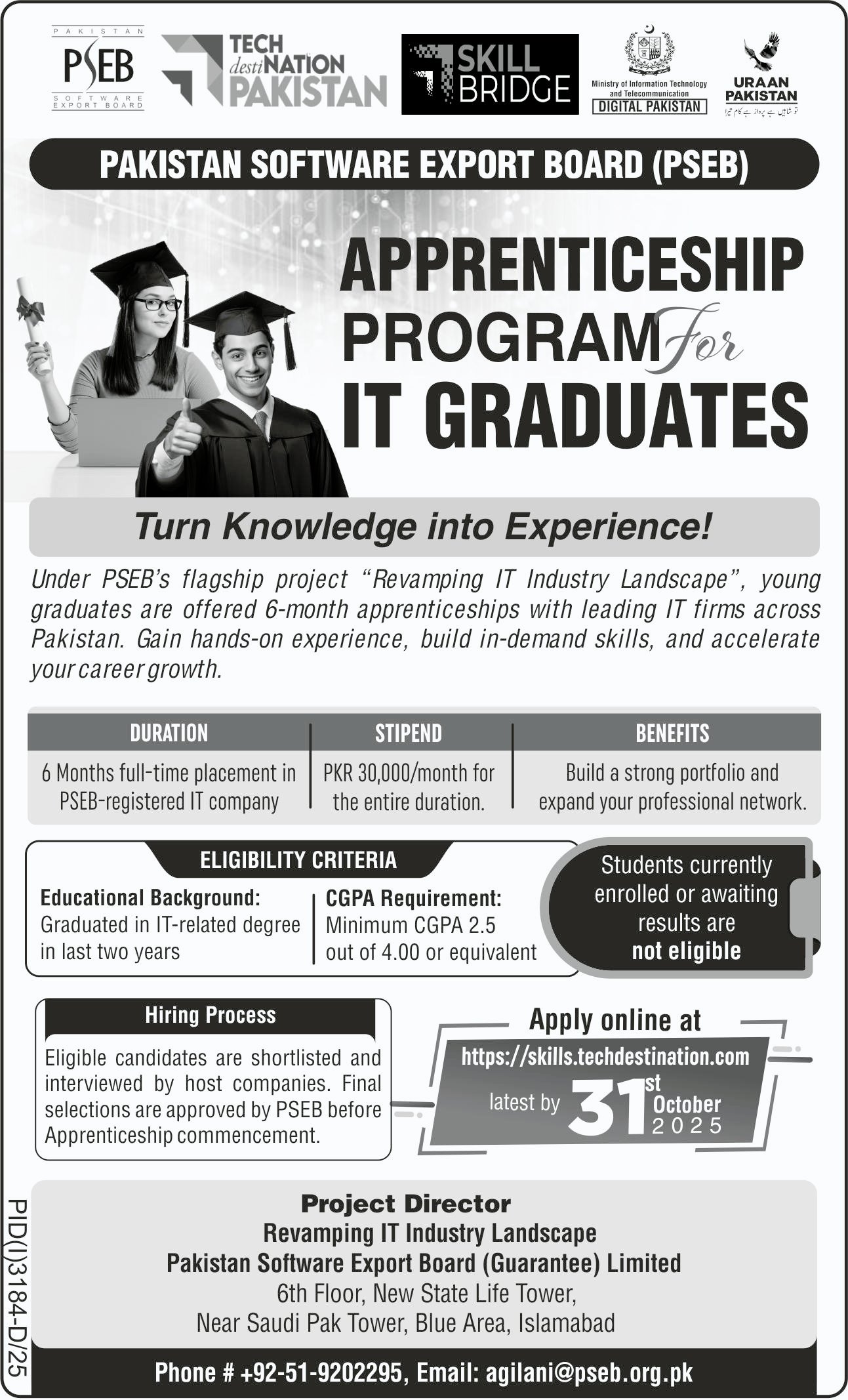 Apprenticeship Jobs At Pakistan Software Export Board PSEB announce the Contract career opportunities for the post of See Below Ad in Federal, Islamabad for the fresh and experienced candidates on Contract basis who have Check Advertisement degree. Posted date of this post is 18/10/2025 and the last date is 31/10/2025. if you are eligible for this job apply before due date.