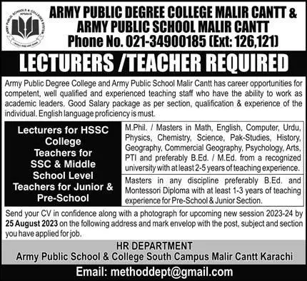 - Interested persons can submit CVs to the HR Department, Army Public School & College South Campus, Malir Cantt, Karachi. You can forward CVs by mentioning the post name before 25th August 2023