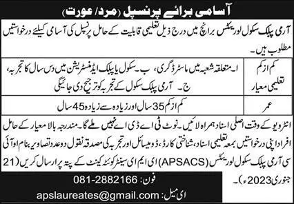 - The Army Public Schools and Colleges System is looking for a Principal at APs Laureates Branch Quetta (Army Public School APS Laureates Branch Quetta Jobs 2023).