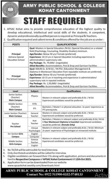 Army Public School & College APS&C Kohat Jobs 2025 announce the Contract career opportunities for the post of See Below Ad in Khyber Pakhtunkhwa, Kohat for the fresh and experienced candidates on Contract basis who have Check Advertisement degree. Posted date of this post is 05/10/2025 and the last date is 12/10/2025. if you are eligible for this job apply before due date.