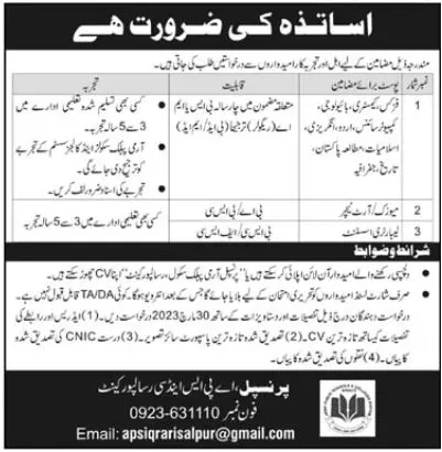 - APS needs teaching staff for Physics, Chemistry, Biology, Computer Science, Urdu, English, Islamiyat, Pakistan Studies, History, Music, Arts, and Geography.
