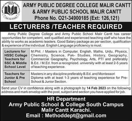 - Army Public Schools and Colleges System is seeking applications from dynamic, result-oriented, and experienced academicians to hire them for Army Public School Malir Cantt and Army Public Degree College Malir Cantt.
