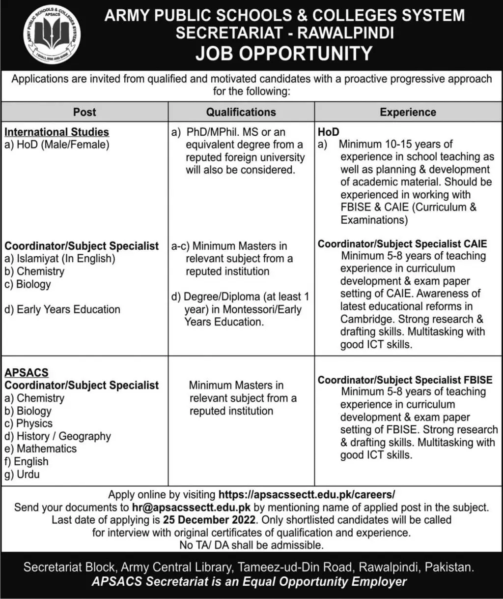 - Army Public School & College, Pakistan Army is looking for candidates for following posts as per job advertisement published in daily Express Newspaper of December 17, 2022 for location Rawalpindi, rawalpindi Punjab Pakistan: biology lecturer coordinator mathematics lecturer chemistry lecturer history lecturer subject specialist lecturer hod physics lecturer head of department urdu lecturer geography lecturer english lecturer teacher and islamiyat lecturer Educational qualifications required MA, Mphil, MS, Master, M.sc and Phd etc. Apply at Army Public School & College latest Government jobs in Teaching and departments before closing date which is around December 25, 2022 or as per closing date in newspaper ad.