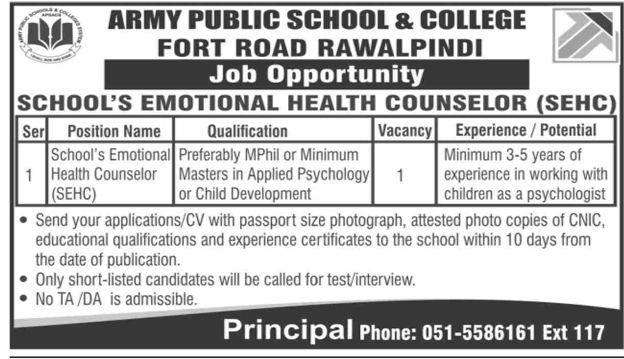 Army Public School & College Rawalpindi Jobs 2026 announce the Contract career opportunities for the post of See Below Ad in Punjab, Rawalpindi for the fresh and experienced candidates on Contract basis who have Check Advertisement degree. Posted date of this post is 28/12/2025 and the last date is 07/01/2026. if you are eligible for this job apply before due date.