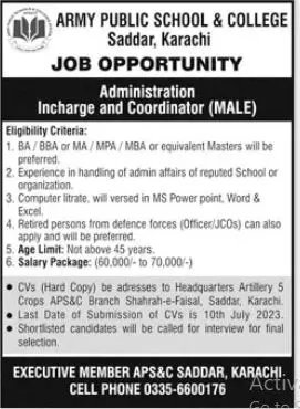 Army Public School & College Sadar Karachi Jobs 2023 announce the Contract career opportunities for the post of See Below Ad in Sindh, Karachi for the fresh and experienced candidates on Contract basis who have Check Advertisement degree. Posted date of this post is 25/06/2023 and the last date is 10/07/2023. if you are eligible for this job apply before due date.