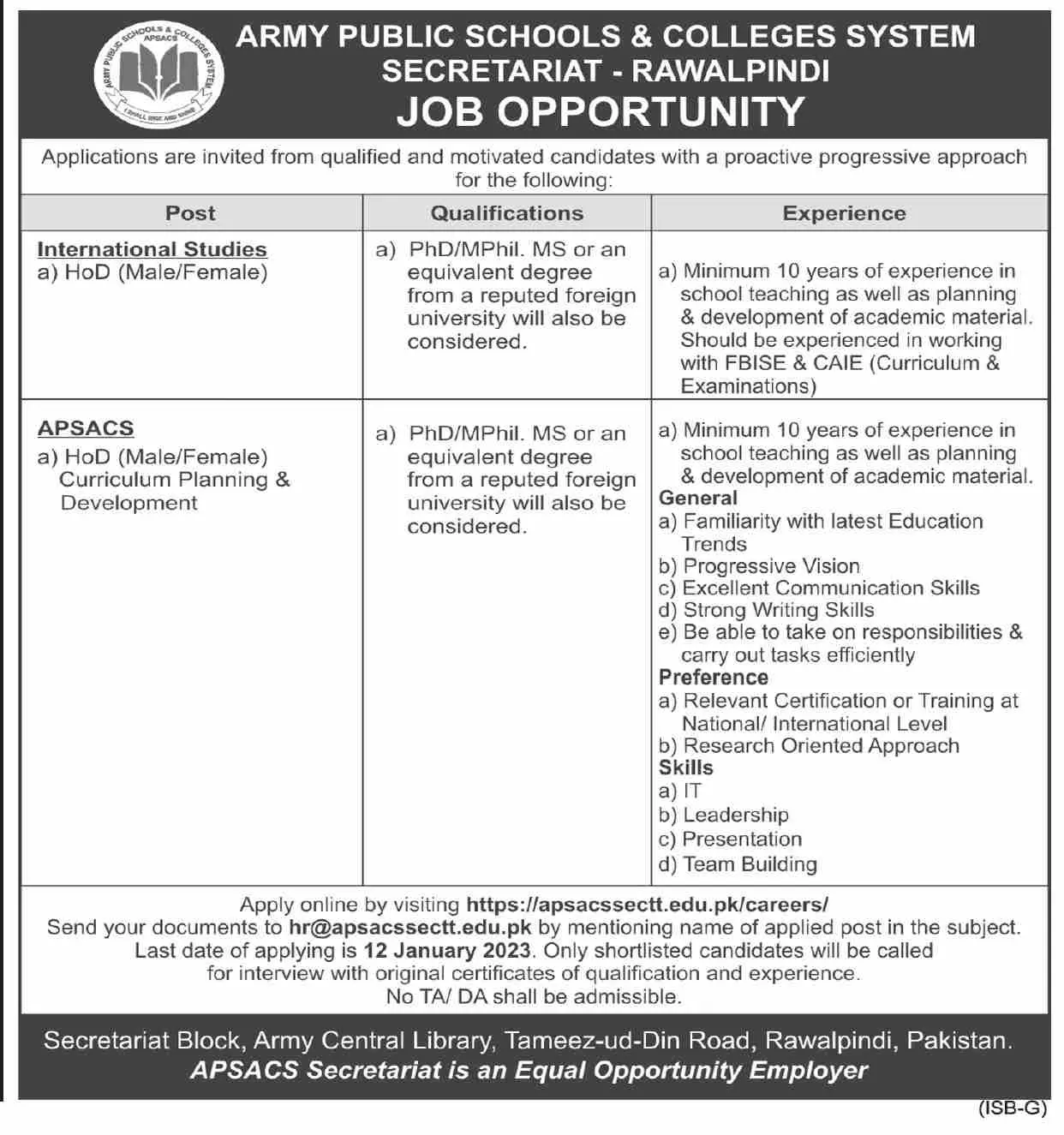 - This page explains Army Public Schools and Colleges System Secretariat Rawalpindi Jobs 2023 Advertisement. Interested persons can get the complete information at https://apsacssectt.edu.pk/careers.