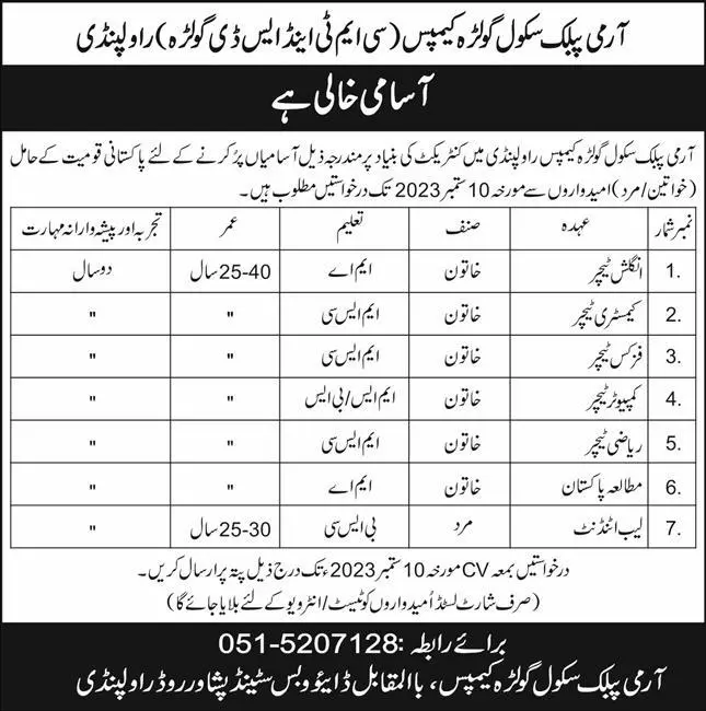 Army Public School Golra Campus Teaching Jobs 2023 announce the Contract career opportunities for the post of See Below Ad in Punjab, Rawalpindi for the fresh and experienced candidates on Contract basis who have Check Advertisement degree. Posted date of this post is 03/09/2023 and the last date is 10/09/2023. if you are eligible for this job apply before due date.