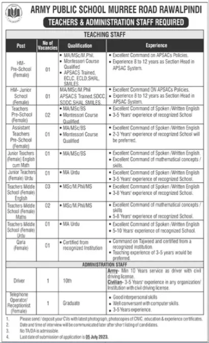 - Here, we describe three advertisements titled Army Public School APS Murree Road Rawalpindi Jobs 2023 Advertisement. Currently, the APS Rawalpindi is seeking applications to recruit HM Pre School, HM – Junior School, Teacher – Pre School, Assistant Teacher – Pre School, Junior Teacher, Teacher – Middle School, Telephone Operator/Receptionist, and Driver.