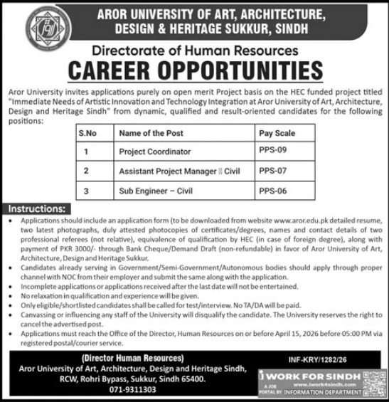 Aror University of Art, Architecture, Design & Heritage Jobs announce the Contract career opportunities for the post of See Below Ad in Sindh, Sukkur for the fresh and experienced candidates on Contract basis who have Check Advertisement degree. Posted date of this post is 01/04/2026 and the last date is 15/04/2026. if you are eligible for this job apply before due date.