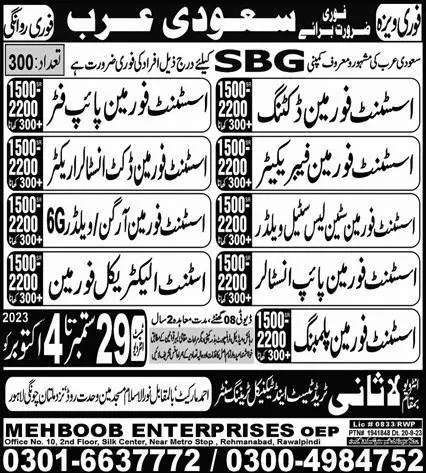 Assistant Foreman Plumbing & Assistant Foreman Jobs 2023 announce the Contract career opportunities for the post of See Below Ad in Saudi Arabia for the fresh and experienced candidates on Contract basis who have Check Advertisement degree. Posted date of this post is 22/09/2023 and the last date is 04/10/2023. if you are eligible for this job apply before due date.
