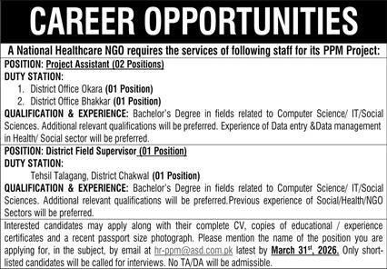 Association for Social Development ASD NGO Okara Jobs 2026 announce the Contract career opportunities for the post of See Below Ad in Punjab, Okara for the fresh and experienced candidates on Contract basis who have Check Advertisement degree. Posted date of this post is 25/03/2026 and the last date is 31/03/2026. if you are eligible for this job apply before due date.