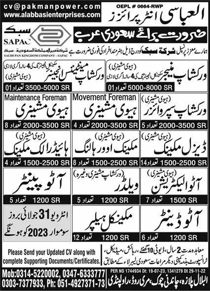 Auto Denter & Workshop Maintenance Engineer Jobs 2023 announce the Contract career opportunities for the post of See Below Ad in Saudi Arabia for the fresh and experienced candidates on Contract basis who have Check Advertisement degree. Posted date of this post is 26/07/2023 and the last date is 31/07/2023. if you are eligible for this job apply before due date.