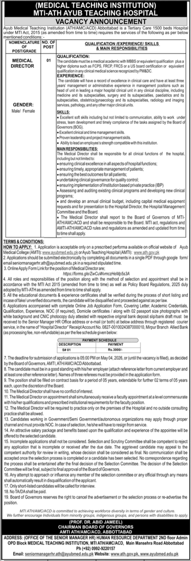 Ayub Teaching Hospital ATH Jobs 2026 For Medical Director announce the Contract career opportunities for the post of See Below Ad in Khyber Pakhtunkhwa, Peshawar for the fresh and experienced candidates on Contract basis who have Check Advertisement degree. Posted date of this post is 14/04/2026 and the last date is 28/04/2026. if you are eligible for this job apply before due date.