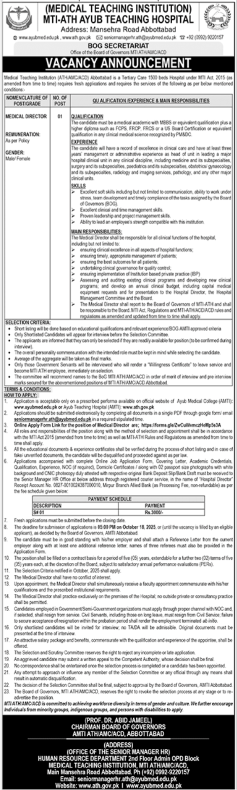 Ayub Teaching Hospital ATH MTI Peshawar Jobs 2025 announce the Contract career opportunities for the post of See Below Ad in Khyber Pakhtunkhwa, Peshawar for the fresh and experienced candidates on Contract basis who have Check Advertisement degree. Posted date of this post is 02/10/2025 and the last date is 18/10/2025. if you are eligible for this job apply before due date.