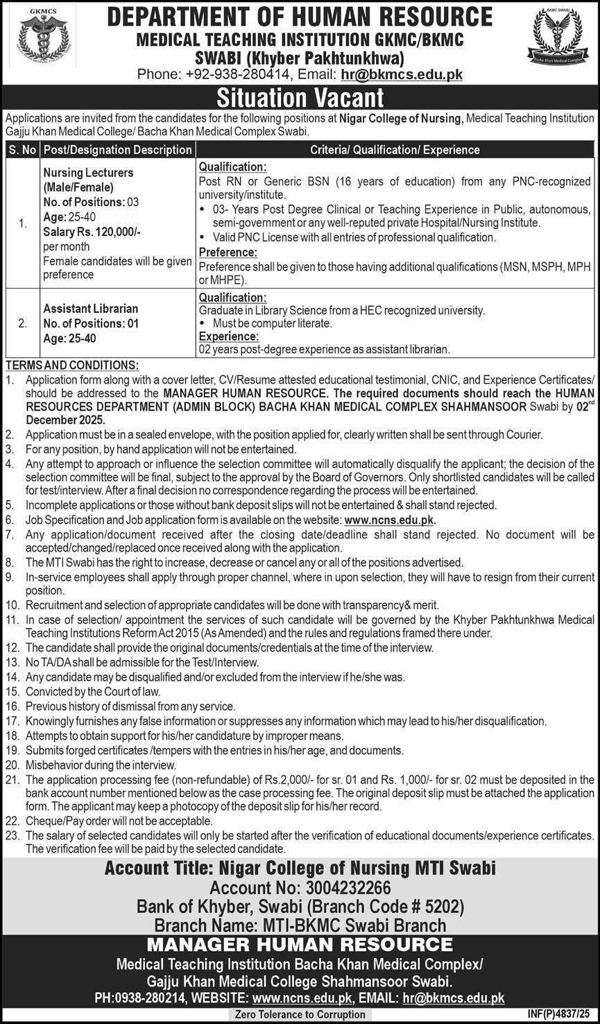 - Application form along with a cover letter, CV/Resume attested educational testimonial, CNIC, and Experience Certificates/ should be addressed to the MANAGER HUMAN RESOURCE. The required documents should reach the HUMAN RESOURCES DEPARTMENT (ADMIN BLOCK) BACHA KHAN MEDICAL COMPLEX SHAHMANSOOR Swabi by 02nd December 2025.