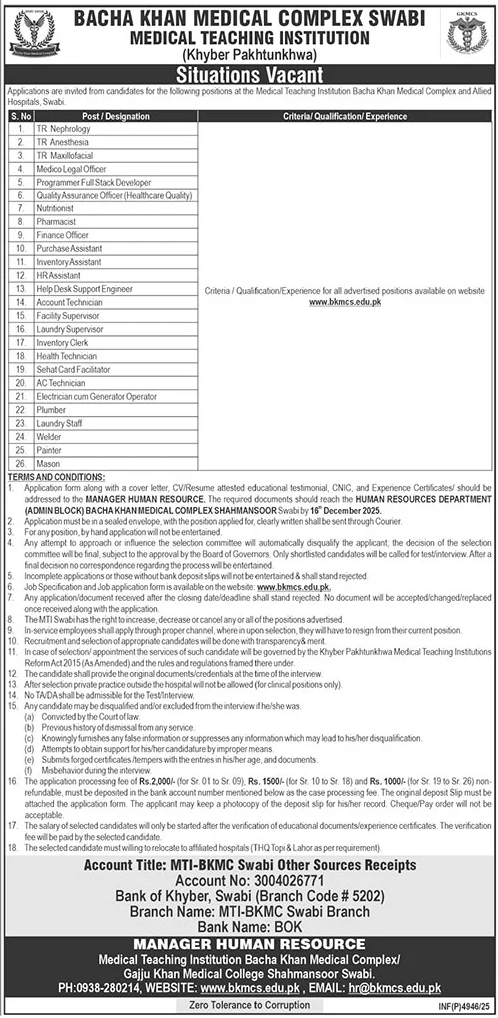 Bacha Khan Medical Complex Jobs 2025 announce the Contract career opportunities for the post of See Below Ad in Khyber Pakhtunkhwa, Swabi for the fresh and experienced candidates on Contract basis who have Check Advertisement degree. Posted date of this post is 22/11/2025 and the last date is 16/12/2025. if you are eligible for this job apply before due date.