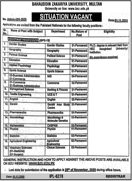 Bahauddin Zakariya University Multan BZU Multan Jobs 2025 announce the Contract career opportunities for the post of See Below Ad in Punjab, Multan for the fresh and experienced candidates on Contract basis who have Check Advertisement degree. Posted date of this post is 14/11/2025 and the last date is 28/11/2025. if you are eligible for this job apply before due date.