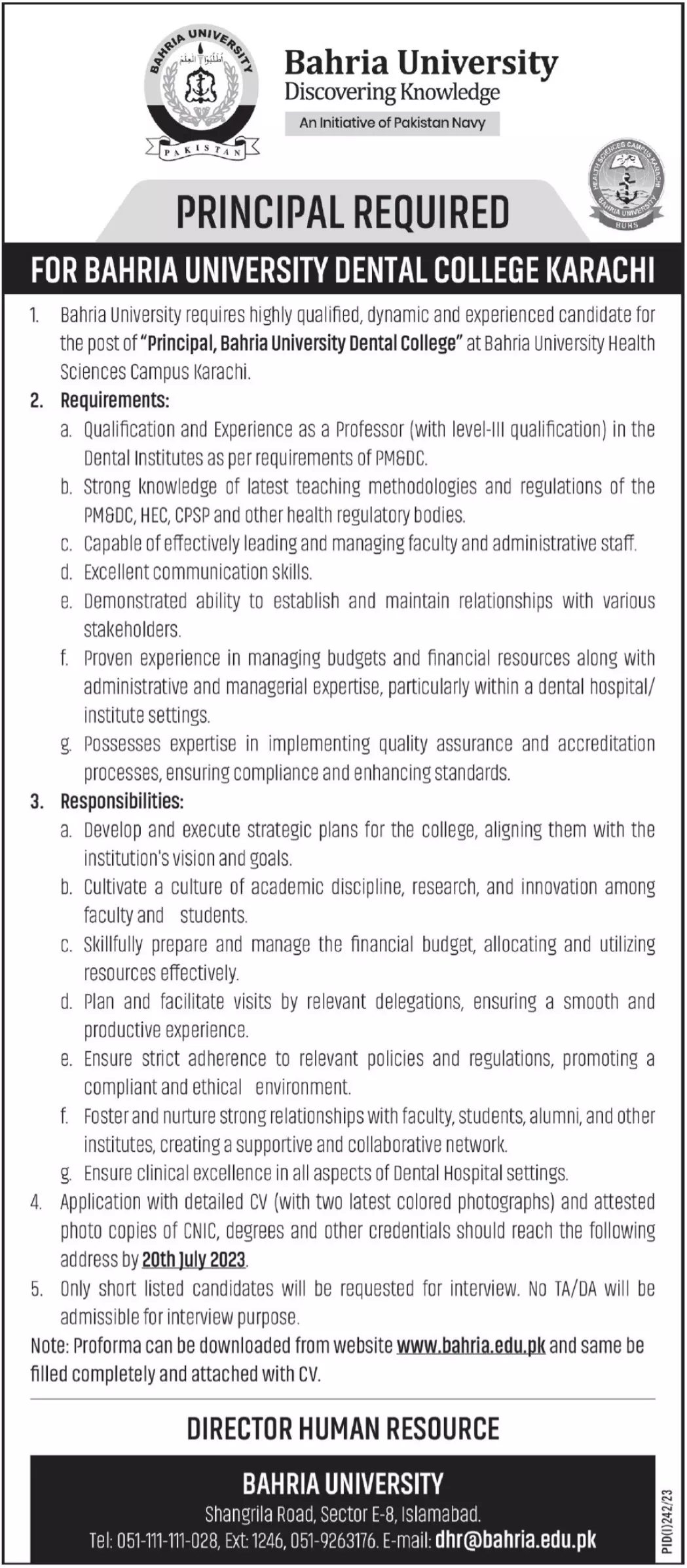 - 1. Bahria University requires highly qualified, dynamic and experienced candidate for the post of "Principal, Bahria University Dental College" at Bahria University Health Sciences Campus Karachi.
