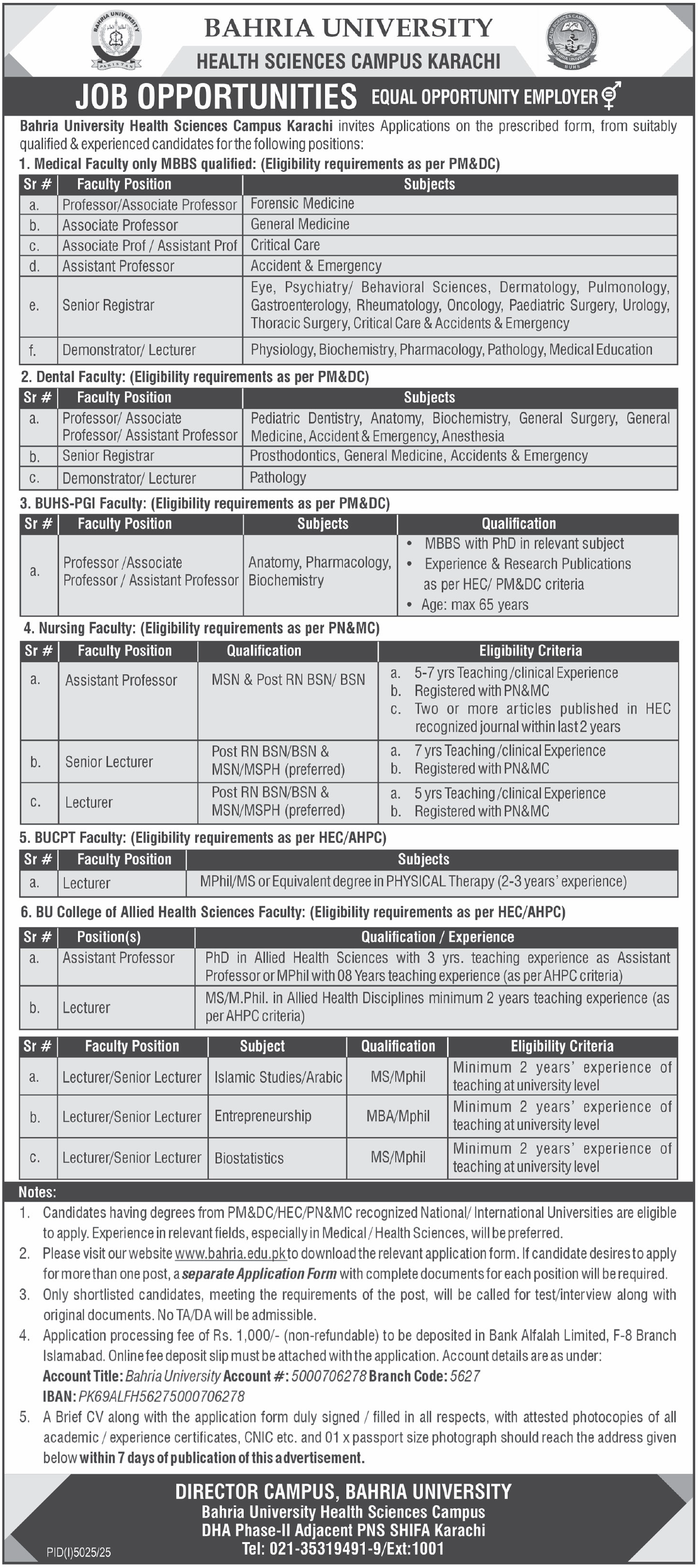 Bahria University Health Sciences Campus Karachi invites Applications on the prescribed form, from suitably qualified & experienced candidates for the following positions: