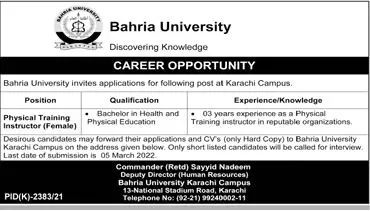 Bahria University Karachi JOBS announce the Contract career opportunities for the post of See Below Ad in Karachi for the fresh and experienced candidates on Contract basis who have Check Advertisement degree. Posted date of this post is 20/02/2022 and the last date is 05/03/2022. if you are eligible for this job apply before due date.