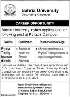- Bahria University is looking for candidates for following posts as per job advertisement published in daily Jang Newspaper of July 23, 2023 for location Karachi, karachi Sindh Pakistan: physical training instructor Bachelor etc.