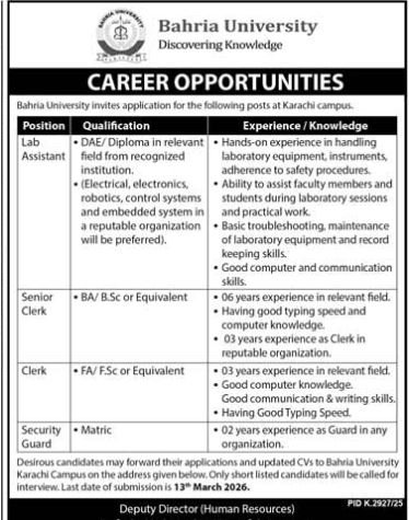 Bahria University Karachi Sindh Jobs 2026 announce the Contract career opportunities for the post of See Below Ad in Sindh, Karachi for the fresh and experienced candidates on Contract basis who have Check Advertisement degree. Posted date of this post is 08/03/2026 and the last date is 13/03/2026. if you are eligible for this job apply before due date.
